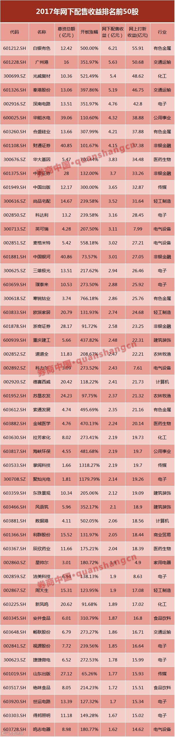 值得一提的是,白银有色、广州港、光威复材和秦港股份等4股由于发行股份较多、上市后涨幅较高,为网下配售投资者创造的收益超过5亿元,位列市场前4名。
