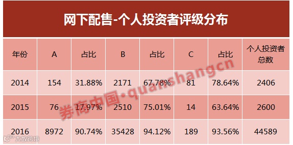 据统计,2014年和2015年期间,获得A类评级的个人投资者分别只有154人和76人,在全体A类投资者的比例分别只为31.88%和17.97%,但在2016年期间,获得A类评级的个人投资者已经达到8972人,占全体A类投资者的比例达到90.74%,网下配售的A类评级可谓是已被个人投资者“攻占”。