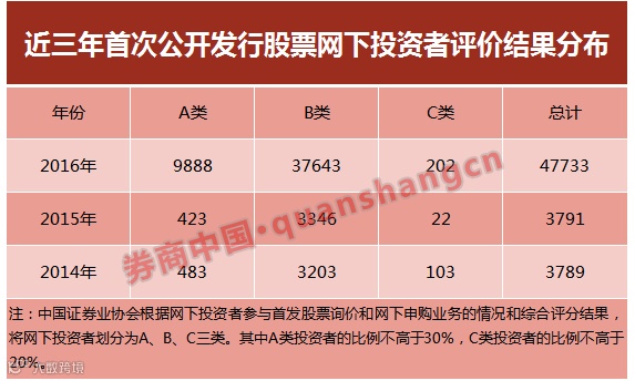 整体来看,2016年全年共有47733名投资者参与首发股票网下配售,相较2015年同比增长1159%。根据网下投资者参与首发股票询价和网下申购业务的情况和综合评分结果,A、B、C三类网下投资者数量分布情况如下: