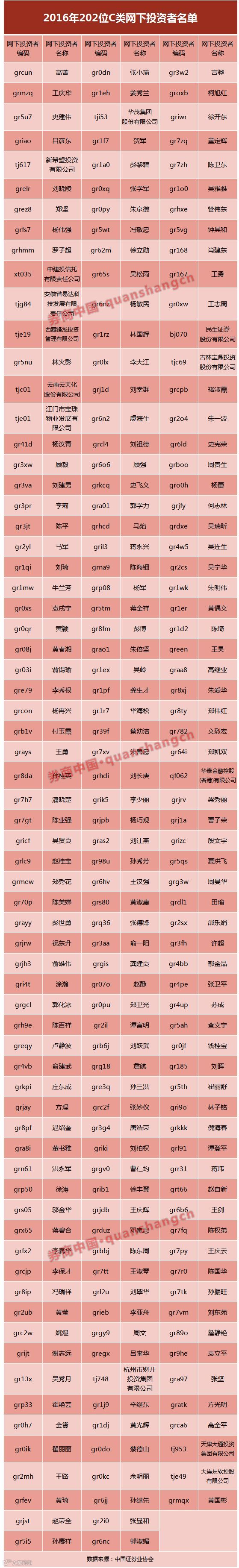 13家被评为C类网下投资者的机构分别是:新希望投资有限公司、中建投信托有限责任公司、安徽省易达科技发展有限责任公司、西藏锋泓投资管理有限公司、云南云天化股份有限公司、江门市宝珠物业发展有限公司、华茂集团股份有限公司、杭州市财开投资集团有限公司、民生证券股份有限公司、吉林宝鼎投资股份有限公司、华泰金融控股(香港)有限公司、天津大通投资集团有限公司、大连东软控股有限公司。