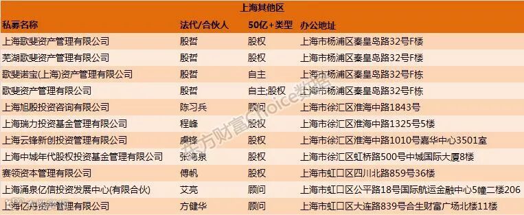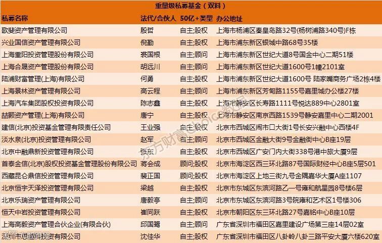 从办公所在地分布来看,上海、北京两地各八家“双料”重量级私募,余下两家则分布在广东省深圳市福田区。