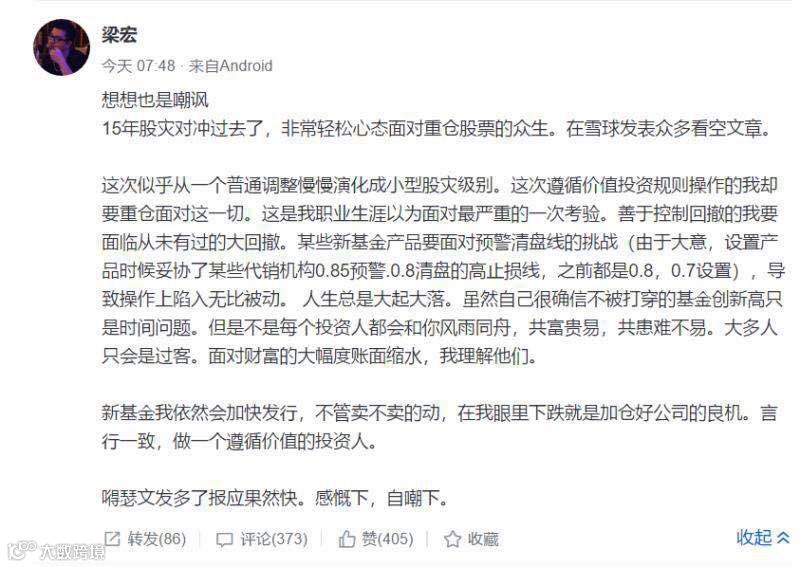 “虽然自己很确信不被打穿的基金创新高只是时间问题。但不是每个投资人都会和你风雨同舟,共富贵易,共患难不易。大多人只是过客,面对财富的大幅度账面缩水,我理解他们。”梁宏称,并认为这是他职业生涯面对最严重的考验。