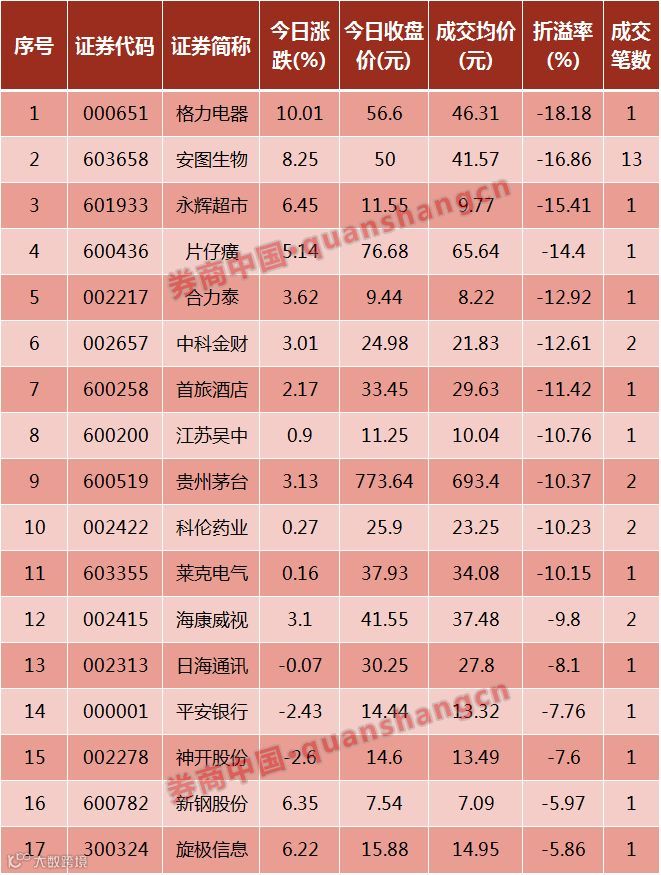 大宗交易折价超过5%的个股共有17只,折价超10%的也有11只。更重要的是,这些大幅折价股票中不乏近期新高不断的蓝筹和白马股: