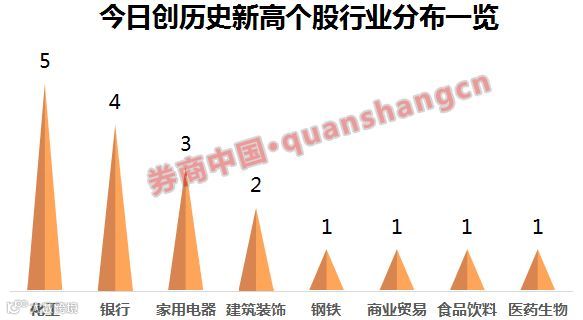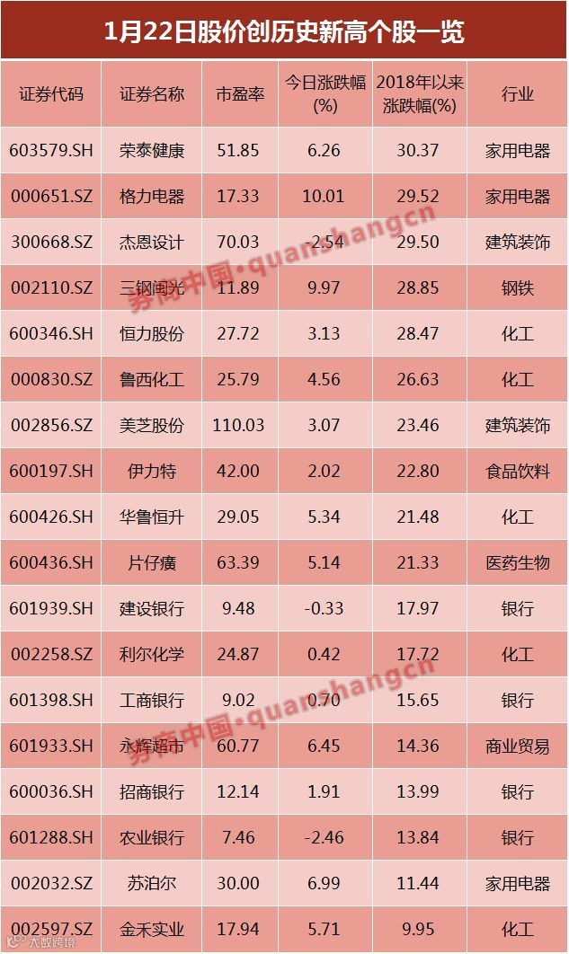 据券商中国记者统计,今日共有18只股票创下历史新高(剔除上市不足半年的股票),分别是荣泰健康、格力电器、杰恩设计、三钢闽光、恒力股份、鲁西化工、美芝股份、伊力特、华鲁恒升、片仔癀、建设银行、利尔化学、工商银行、永辉超市、招商银行、农业银行、苏泊尔、金禾实业。