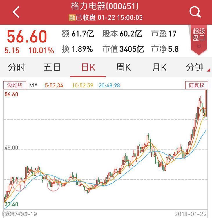 今日,格力电器强势涨停,报价56.6元。虽说这一年多格力电器涨幅较大,但涨停对于这只大蓝筹并不多见,数据显示,这也是格力电器2017年以来第一次涨停。