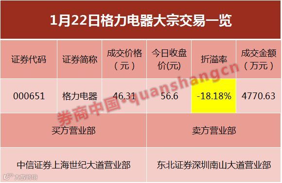 大宗交易数据却显示,格力电器出现一笔折价率为18.18%的大宗交易,买方为中信证券上海世纪大道营业部,卖方为东北证券深圳南山大道营业部,成交价46.31元,成交额4770万元。