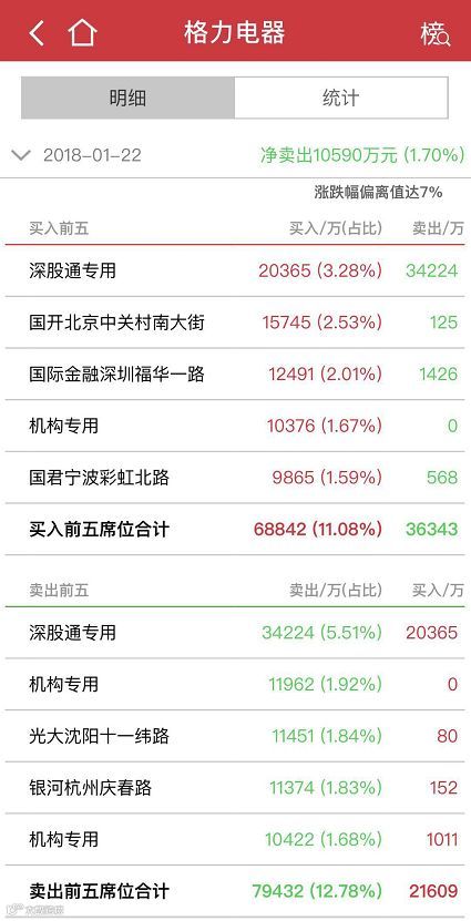 格力电器今日涨停,股价创历史新高。龙虎榜数据显示,买入前五席位共买入6.88亿元,其中一家机构买入1.04亿元;卖出前五席位共卖出7.94亿元。其中,深股通席位买入2.04亿元同时卖出3.42亿元,净卖出1.39亿元,两家机构合计卖出2.23亿元。