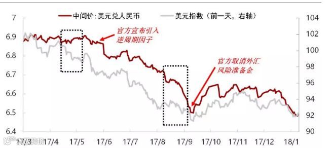 去年5月份,央行引入逆周期因子调节后,人民币持续贬值走势和市场主体贬值预期显著扭转,人民币兑美元汇率从5月初6.9左右出发,升值加速。自2017年5月26日至9月9日,人民币兑美元在岸和离岸汇率累计升值了近4000基点。人民币汇率指数也止跌回升。至年底兑美元已位于6.5左右。按官方口径计算,兑美元全年市场汇率升值6.72%,中间价升值6.16%。