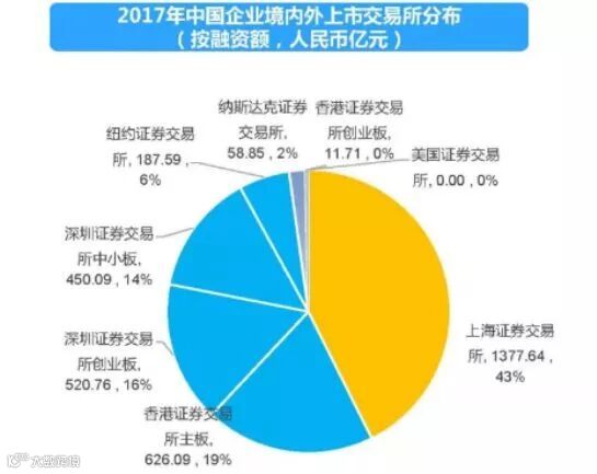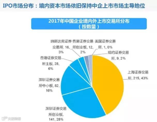 我们先看看2017年,中国企业境内外上市的交易所分布情况。显然,在2017年IPO加速的背景下,2017年共有380家企业IPO申请成功过会,较2016年申请成功过会的企业数量249家同比增长52.61%。国内资本市场成为企业上市的首选地,沪深两市几乎平分秋色。