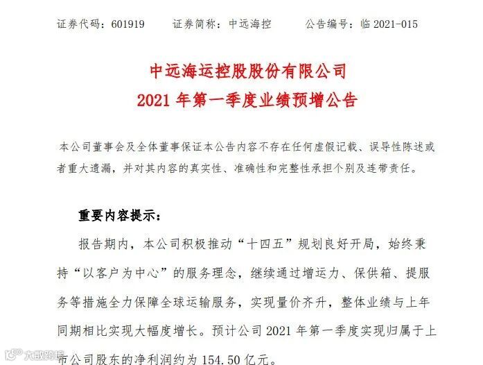 中远海控是间接控股股东中国远洋海运集团核心产业中重要的组成部分,系承担集装箱航运服务供应链的上市平台。4月6日晚间披露业绩预告,一季度中远海控预盈154.5亿元。相比,上年同期净利润约为2.92亿元。