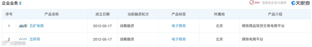 天眼查APP数据显示,此次被立案调查的龙腾数科旗下,共有两个电商平台,一个是钢铁商品现货交易电商平台“鑫益联”,一个是钢铁电商平台“五阿哥”。