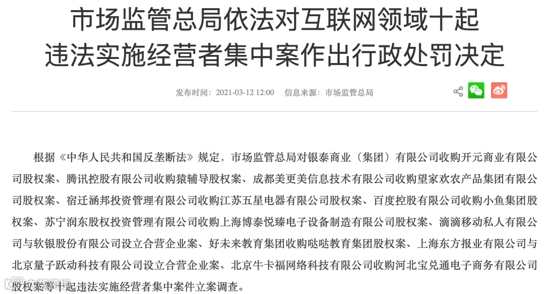 无独有偶,3月12日,市场监管总局发布公告称,依法对包括腾讯、百度以及阿里巴巴、美团、京东、苏宁、滴滴等控制的关联方在内的12家中国互联网科技公司作出顶格处罚,分别处以罚款50万元。