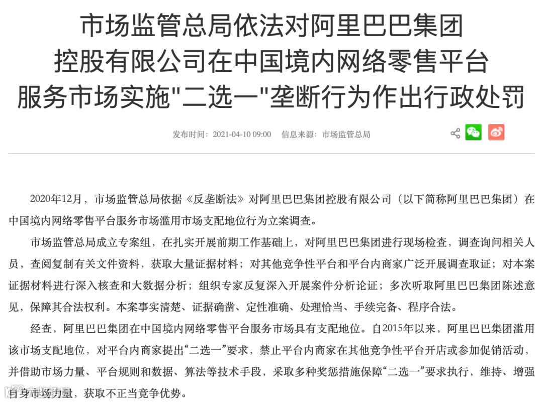最令人印象深刻的莫过于4月10日,市场监管总局依法对阿里巴巴“在中国境内网络零售平台服务市场实施‘二选一’垄断行为”作出行政处罚,责令其停止违法行为,并处以其2019年销售额4%计182.28亿元的巨额罚款。