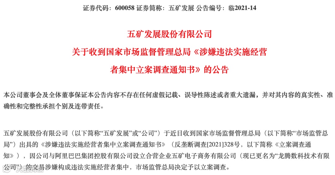 公告显示,市场监管总局近日对五矿发展出具了《涉嫌违法实施经营者集中立案调查通知书》,因五矿发展与阿里巴巴集团控股有限公司设立合营企业——五矿电子商务有限公司(现已更名为“龙腾数科技术有限公司”,简称“龙腾数科”)的交易涉嫌构成违法实施经营者集中,故决定予以立案调查。