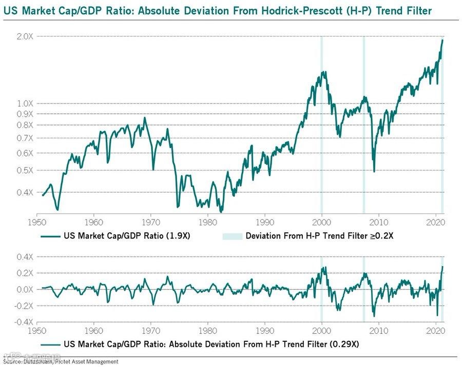 据最新数据显示,当前美股市场的“巴菲特指标”已经达到190%,高于2000年初科网泡沫时期峰值,甚至超过1929年“大萧条”前该指标的峰值,是历史上最贵的水平。