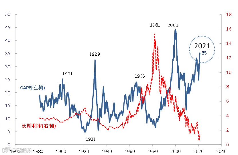 《非理性繁荣》的作者、诺贝尔经济学奖得主罗伯特·席勒曾对1870年以来的美股的泡沫进行过深度研究,提出用十年期周期市盈率(CAPE)代替12个月市盈率指标来对美股进行评估,这一估值体系可以准确识别1929年大萧条前的股市泡沫、2000年科技股泡沫,这个指标被称为席勒市盈率指标(Shiller PE)。