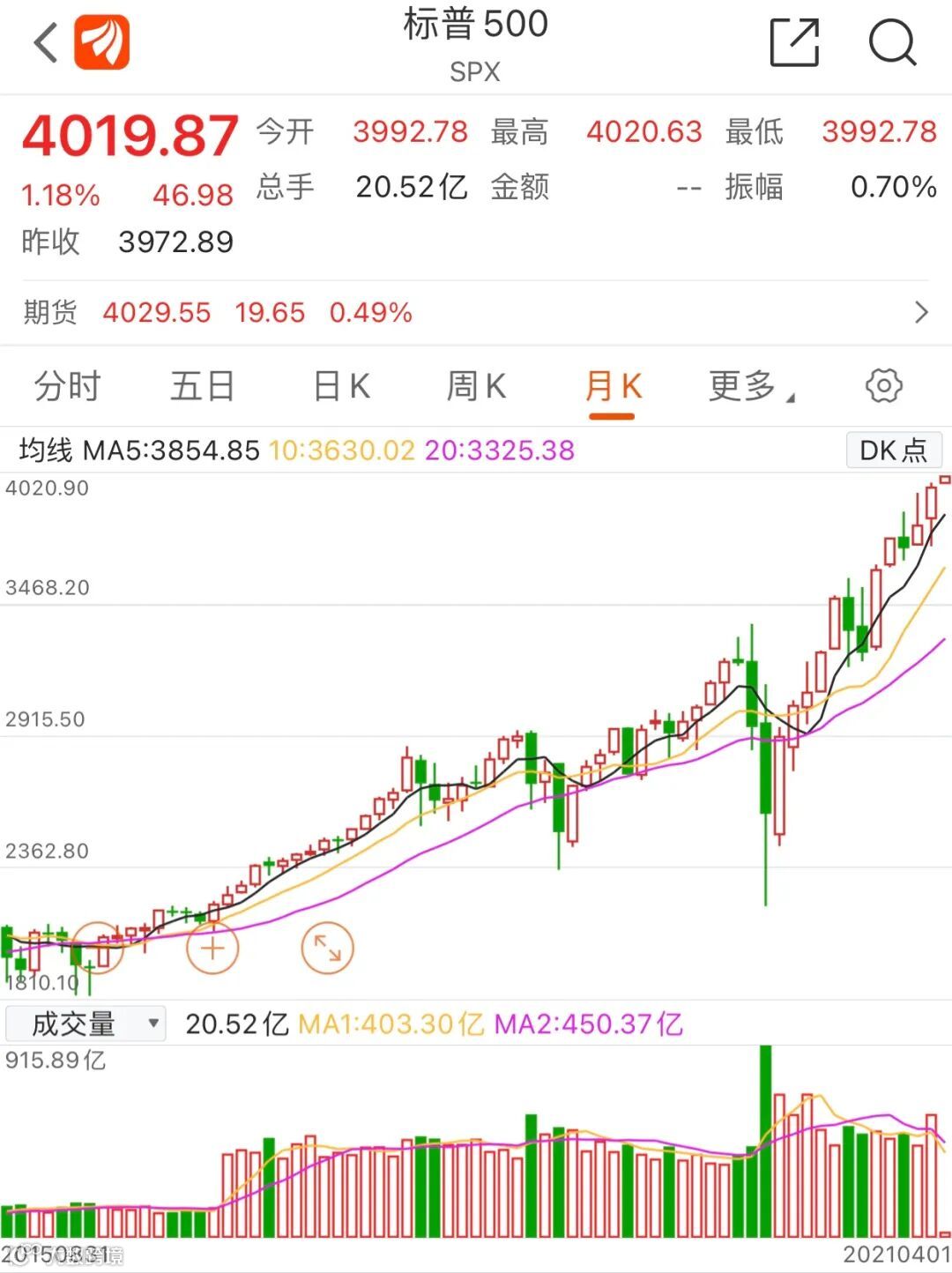 此后,在绝望中逆转,并开启了牛市,当地时间4月1日收盘,标普500指数刷新历史新高,达到4019.87点,累计涨幅超过500%。