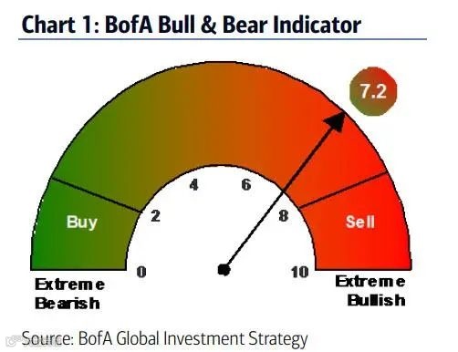 另外,美银美林分析师Michael Hartnett表示,美股泡沫化快要来到顶峰,美国金融资产规模达到美国GDP的6倍,牛熊指数从此前的7.1进一步升至7.2,意味着当前美股市场处于严重超买区间。