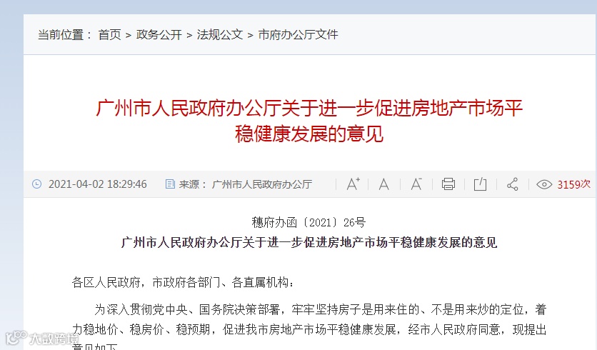 4月2日,广州市印发了《广州市人民政府办公厅关于进一步促进房地产市场平稳健康发展的意见》(下称《意见》),将重拳整治房地产市场秩序,着力稳地价、稳房价、稳预期,促进广州房地产市场平稳健康发展。《意见》将于4月3日起正式执行。