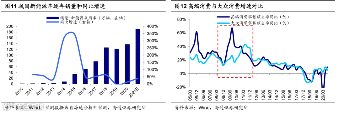 第二,大众消费。回顾08年金融危机历史经验,货币宽松、四万亿等刺激政策推出后,汽车等高端消费增速先回升,之后粮油、食品、饮料等大众消费增速崛起。2020年可选消费品中汽车和高端白酒表现亮眼,预计21年乳制品、餐饮等大众消费需求或将大增。今年“两会”强调坚持扩大内需,十四五规划正文再次强调加快构建以国内大循环为主体、国内国际双循环相互促进的新发展格局,未来消费品牌化、服务化趋势将更加明显。此外,随着收入水平的增加和健康意识的提升,预计专科医院、高端医疗器械、医疗美容、养生保健等医疗服务领域需求也有望提升。