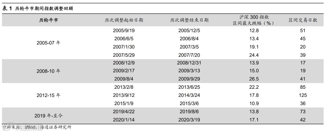 这次调整更像14Q4、07Q1。历史上一轮牛市中大回撤3-4次,本次牛市从19年初开始,我们以沪深300指数刻画,19年1月以来的大调整目前有三次,第一次是2019/04/22-2019/08/06,沪深300指数区间最大跌幅为13%,第二次是2020/01/14-2020/03/19,最大跌幅17 %,这两次大调整都是源于市场上涨一段时间后基本面没有跟上。