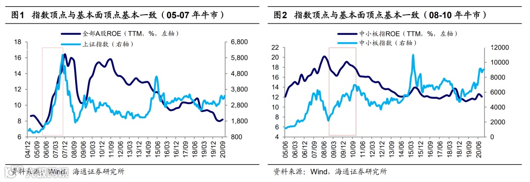 其中:牛市前半段1-2次大的调整一般源自基本面没跟上市场的表现,如05-07年牛市中05年9-12月的调整中沪深300最大跌幅13%,同期工业企业利润累计同比从05年8月的21%降至05年11月的19%。又如08-10年牛市中2008/12/9-2008/12/31这次大调整源自四万亿投资计划刺激下基本面并未立刻跟上,A股归母净利累计同比从08Q3的7.0%继续下滑至09Q1的-26.2%,期间沪深300最大跌幅为14%,中小板指为5.8%。