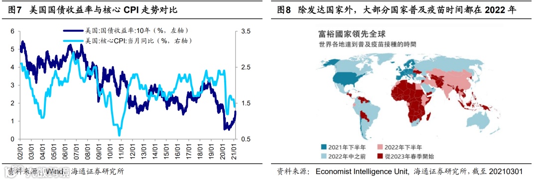 往后看,通胀何时大幅上升要看经济复苏力度,而这又取决于疫情控制情况,疫情控制主要看疫苗接种程度:目前(截至20200312,下同)发达国家疫苗接种明显较快,如美国目前接种率约为29%,但全球的接种率只有4%,经济学人预测疫苗在发达国家普及大概在今年下半年能完成,但是在其他国家普及都要等到2022年,因此今年全球的通胀我们预计只是温和通胀。此外,3月11日美国众议院终于通过了拜登的1.9万亿刺激计划,考虑到美国财政部的发债需求以及未来通胀较为温和,我们认为流动性并不会大幅收紧。