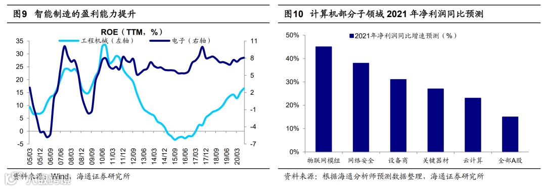 第一,智能制造。强化国家战略科技力量是2021年头号任务,13日发布的《中华人民共和国国民经济和社会发展第十四个五年规划和2035年远景目标纲要》正文中开篇第二篇即是与科技创新相关的“坚持创新驱动发展全面塑造发展新优势”,第三篇则是与高端制造与战略性新兴产业相关的“加快发展现代产业体系巩固壮大实体经济根基”。当前我国正处5G引领的新一轮科技周期中,最终通过科技赋能制造,实现制造业的升级,制造强国是实体经济的根基。19-20年科技领域的机会主要体现在半导体、芯片、光伏、电动车电池领域,21年科技将进一步与制造业融合,即智能制造,如汽车智能化、5G改造生产端(云计算、人工智能)、高端制造等。近几年以工程机械、电子等为代表的中国智能制造的ROE中枢已经逐渐抬高,说明产业结构升级已经在见效,而疫情对全球产业链的重构,利于中国制造进一步升级。