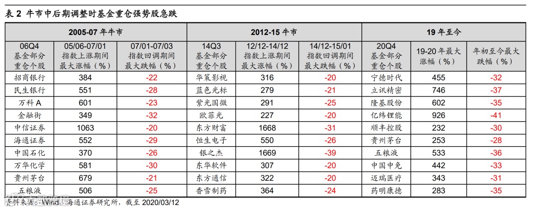 春节之后的调整我们定性为本轮牛市的第三次大调整,诱因是美债利率上升和通胀预期快速上升。这次的回撤我们认为更像07Q1和14Q4,属于牛市中后期的回撤,特点是前期基金重仓的强势股急跌,冷门股补涨。05-07年牛市的主线是地产链,从05年6月开始至07年1月底,万科A、万华化学、招商银行、中信证券等基金重仓股涨幅都在3倍以上, 07年2月后,直至3月前行情开始从主线上涨过渡到轮涨阶段,以中证1000为代表的小市值个股快速上涨,整个2月涨幅近20%,而前述强势股普遍回撤,最大跌幅均在30%左右。12-15年牛市的主线是TMT,银之杰、东方财富、蓝色光标、恒生电子等基金重仓股从12年开始到14年12月前都翻了多倍,但是进入12月后一个月的时间内前期滞胀的金融股暴涨,前期领涨的重仓股则大幅回调,最大回撤基本在30%左右。本次牛市基金重仓股在春节假期回来2月18号之后暴跌,贵州茅台最大跌幅28%,隆基股份35%,中国中免33%,立讯精密37%,大部分的重仓股跌幅都在30%左右,但同时中证1000区间跌幅只有1%,全市场还有近3000只个股春节后至今取得了正收益。这种现象本质上和07Q1和14Q4一样,是牛市中后期的调整,并不意味着牛市就此结束。
