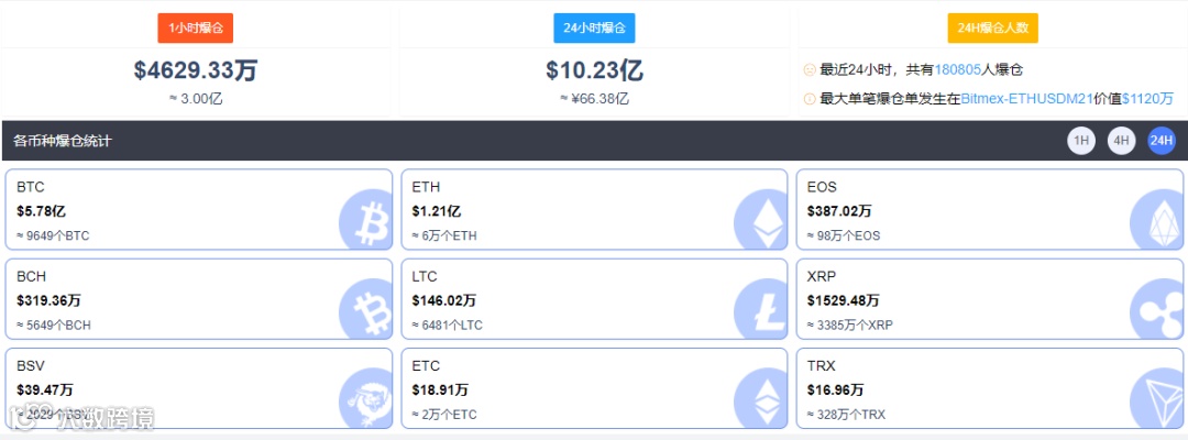 比特币价格的剧烈波动,也导致加密货币市场爆仓金额猛增,据比特币家园统计,近24个小时内,有18万人爆仓,爆仓金额超66亿元。其中,最大一笔爆仓单发生在Bitmex-ETHM21价值1120万元。