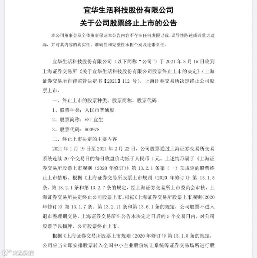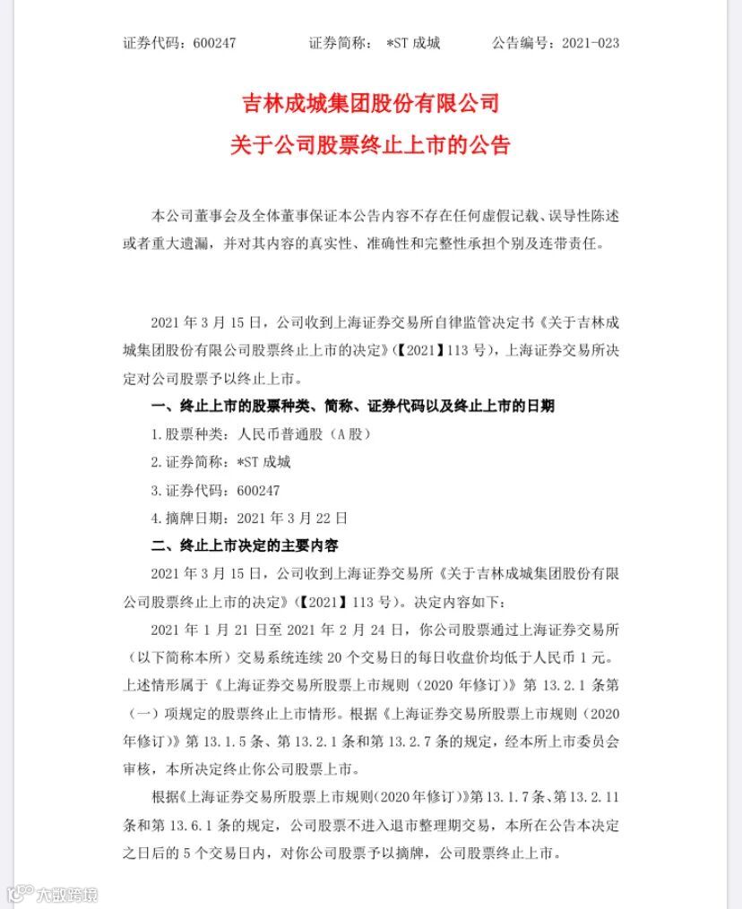 *ST成城的退市情况与*ST宜生相同,公司股票自2021年1月21日至2021年2月24日,连续二十个交易日的每日收盘价均低于人民币1元,将于3月22日终止上市。公司股票终止上市后,同样将转入全国中小企业股份转让系统进行股份转让。