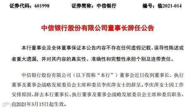 3月15日,中信银行公告称,因工作安排,李庆萍已辞去该行董事长、执行董事及董事会战略发展委员会主席和委员职务。