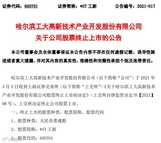 5日晚间,*ST工新发布公告称,收到上海证券交易所《关于哈尔滨工大高新技术产业开发股份有限公司股票终止上市的决定》,上交所决定终止公司股票上市。