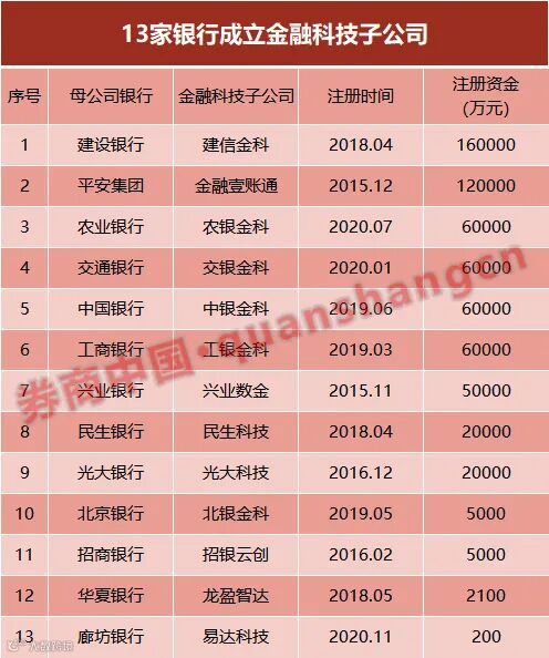 券商中国记者统计,截至目前,共有5家国有行、6家股份行和北京银行、廊坊银行2家城商行成立金融科技子公司。其中,建设银行旗下的建信金科注册资本最高,达16亿元,廊坊银行最低,仅为200万元。