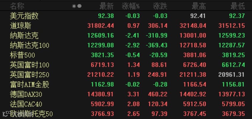 周一美股收盘走势分化,道指涨逾300点或0.97%,盘中创历史新高;纳指则大跌2.41%,创近三月新低;标普500指数跌0.54%。盘面上看,科技股、新能源汽车股全线下跌。苹果跌超4%,奈飞跌4.47%,谷歌跌4.27%,Facebook跌3.39%;特斯拉跌近6%,蔚来汽车跌7.64%,理想汽车跌5.03%。芯片股大跌,英伟达跌近7%,AMD跌近6%。