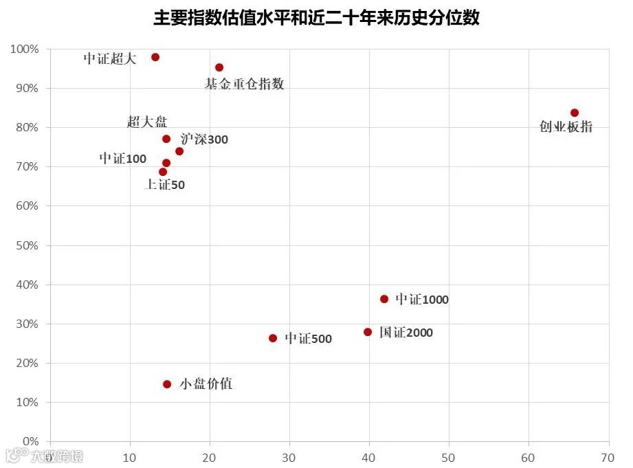 虽然整体估值不贵,但A股的估值分化则相当严重。以大盘股为代表的指数估值处于较高的分位水平,比如上证50(64.01%)、沪深300(75%),尤其是基金抱团和重仓的股票估值达到了历史最高水平。但是以中小盘股票代表的中证500、中证1000以及国证2000等均处于历史40%以下的分位水平。