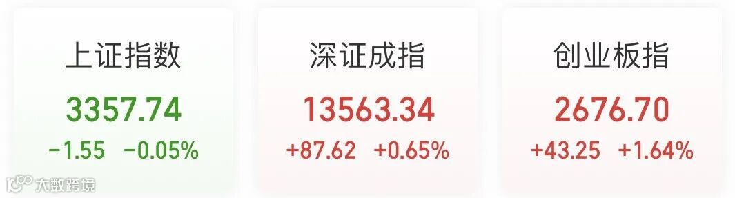 一是,反弹不及预期。三大股指高开低走,午后集体走弱,并且K线全部都收出了阴线,上证指数尾盘更是翻绿,反弹力度显然不及预期。截至收盘,上证指数下跌0.05%,收报3357.74点;深证成指小幅收涨0.65%,收报13563.34点;创业板指上涨1.64%,收报2676.70点。
