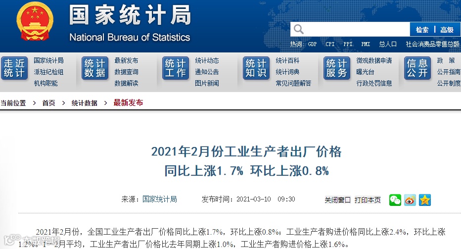 2月PPI同比上涨1.7%,涨幅比上月扩大1.4个百分点,其中生产资料价格涨幅扩大1.8个百分点,生活资料价格降幅与上月相同。环比看,PPI上涨0.8%,涨幅比上月回落0.2个百分点。其中,生产资料价格上涨1.1%,涨幅回落,生活资料价格由上涨转为持平。