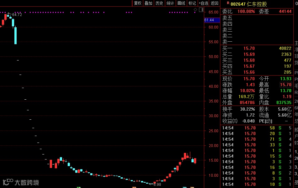 3月19日,仁东控股(002647)又起妖风,在下午大盘大幅下挫时逆势拉涨。截至收盘,4万手买单牢牢将股价封死涨停。全天成交额达到25.1亿元,换手率为30.22%。