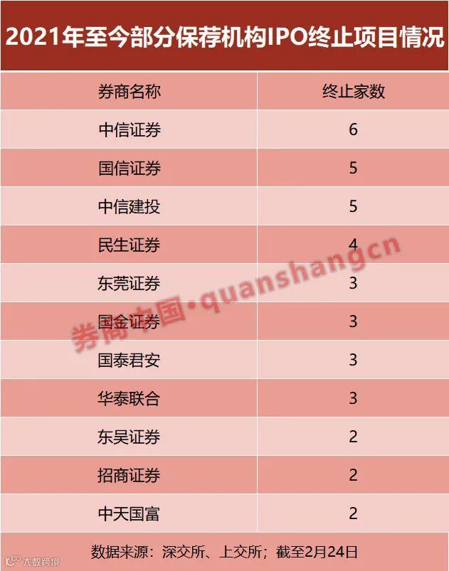在保荐机构方面,中信证券今年以来IPO终止项目数量最多,共有6单,比如有此前饱受争议的柔宇科技、恐龙园。国信证券与中信建投紧跟其后,均有5单,其中,中信建投有一单被否项目——灿星文化。民生证券有4单。东莞证券、国金证券、国泰君安、华泰联合各有3单终止项目。