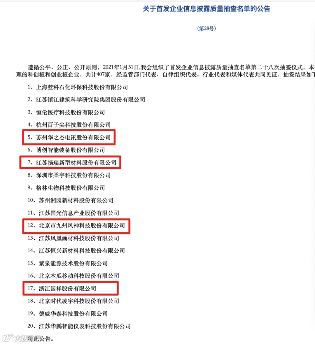 据了解,今年1月31日证券业协会组织首发企业信息披露质量抽查名单第二十八次抽签仪式,抽签名单共有20家,其中包括深圳市柔宇科技股份有限公司、北京木瓜移动科技股份有限公司。