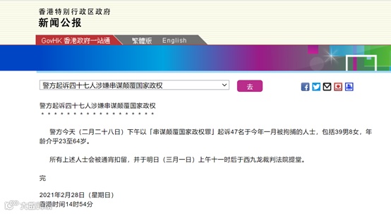 香港特区政府28日也发布新闻公报称,警方今天(2月28日)下午以“串谋颠覆国家政权罪”起诉47名于今年一月被拘捕的人士。