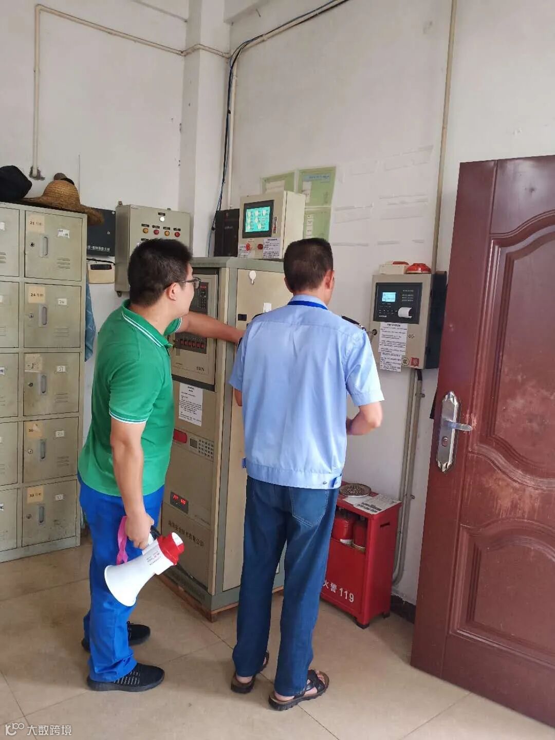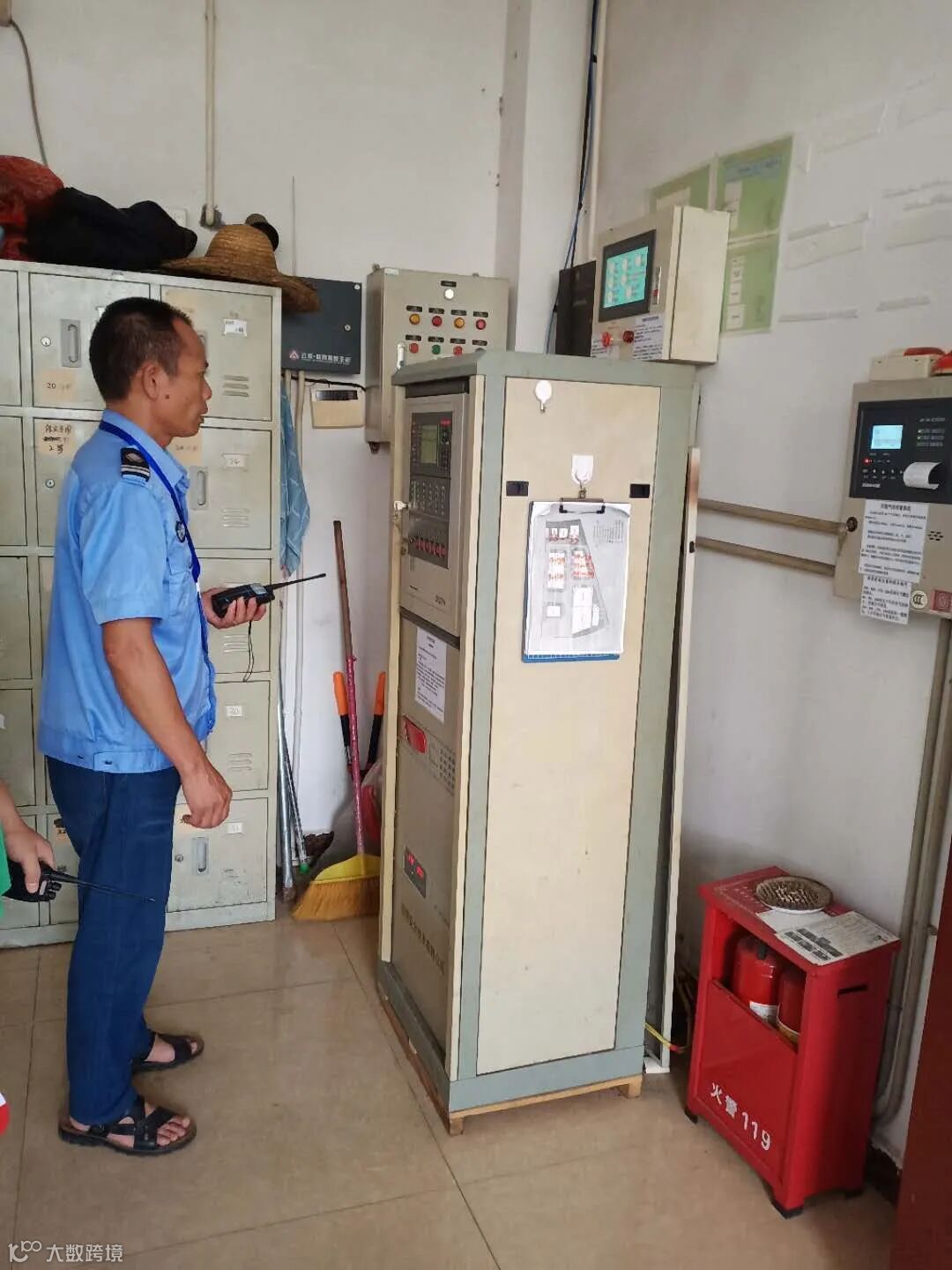 工程部员工到空压机房关闭空压机,到消防泵房检查消防泵状态,随后到发电机房待命。