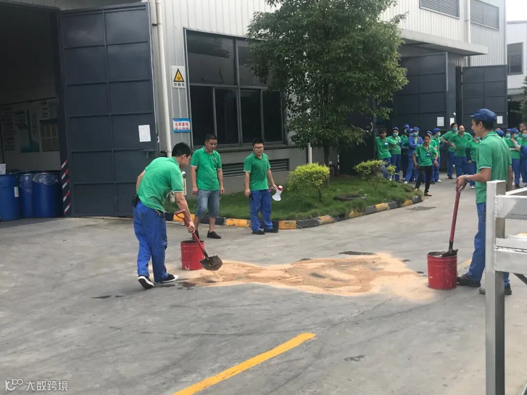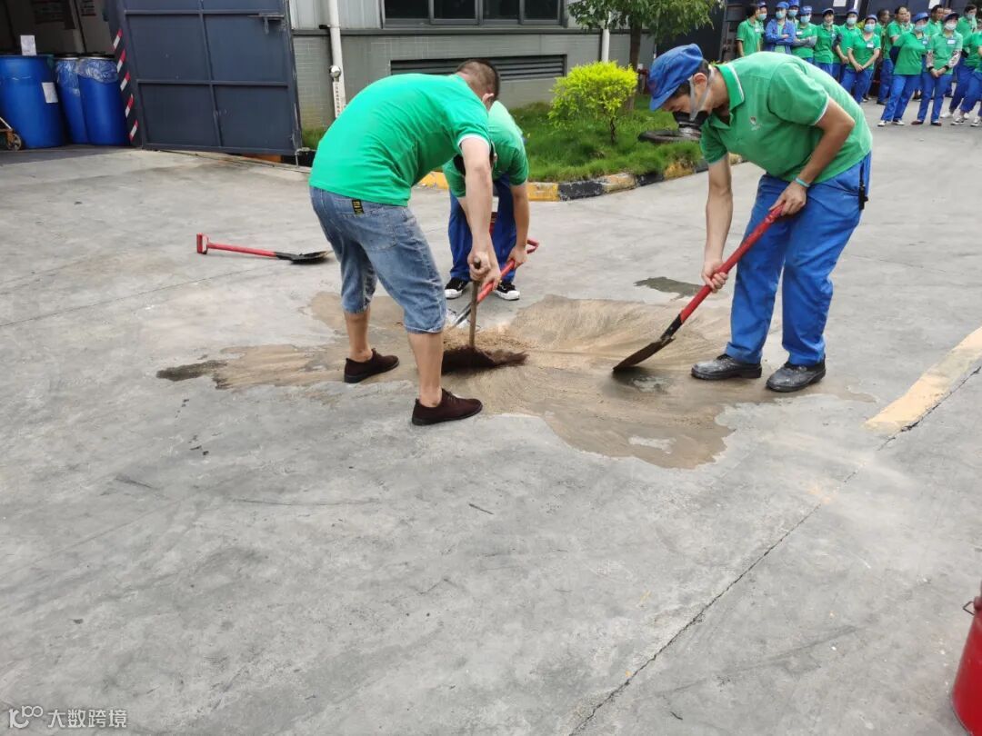 演练模拟配料车间门前一原料大桶在发料时倾倒,大桶内的危险化学品(演练时装自来水)泄露。