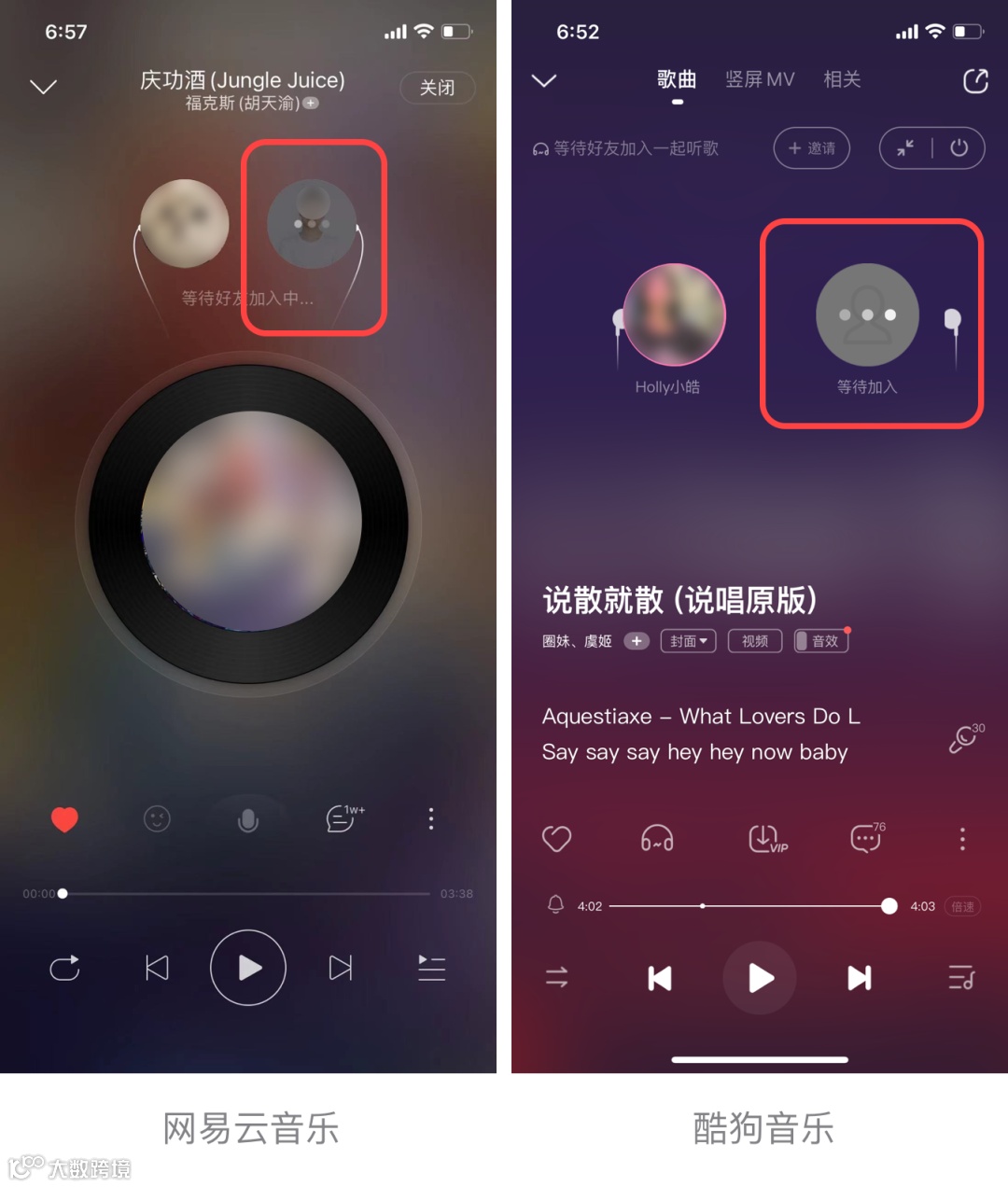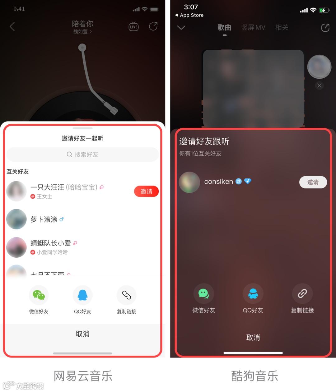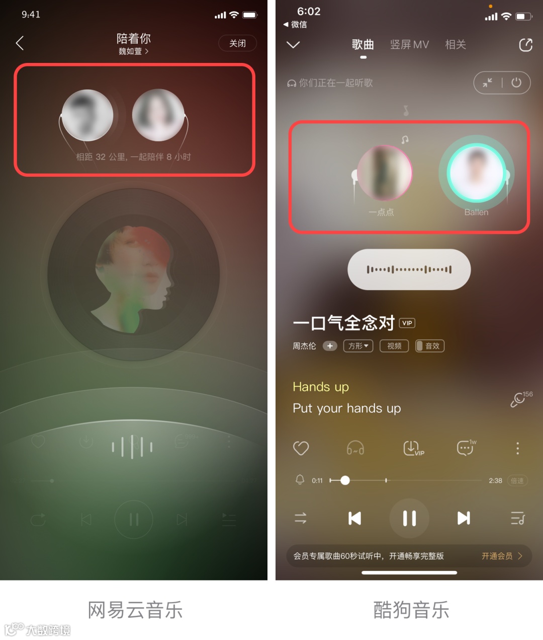 一周前,我们可喜地发现,酷狗上线“跟听”功能,对网易云音乐“一起听”的模仿到了像素级的地步,具体如下:
