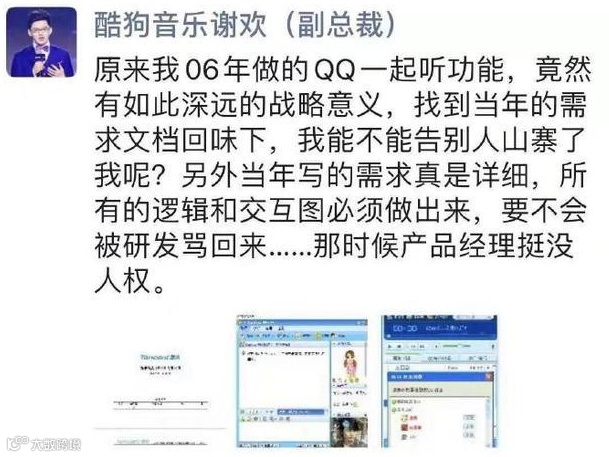 值得注意的是,酷狗音乐CEO谢欢今日发朋友圈疑似回应被指抄袭一事,他称:“原来我06年做的QQ一起听功能,竟然有如此深远的战略意义,找到当年的需求文档回味下,我能不能告别人山寨了我呢?另外当年写的需求真是详细,所有的逻辑和交互图必须做出来,要不会被研发骂回来。。。。。。那时候产品经理挺没人权。”