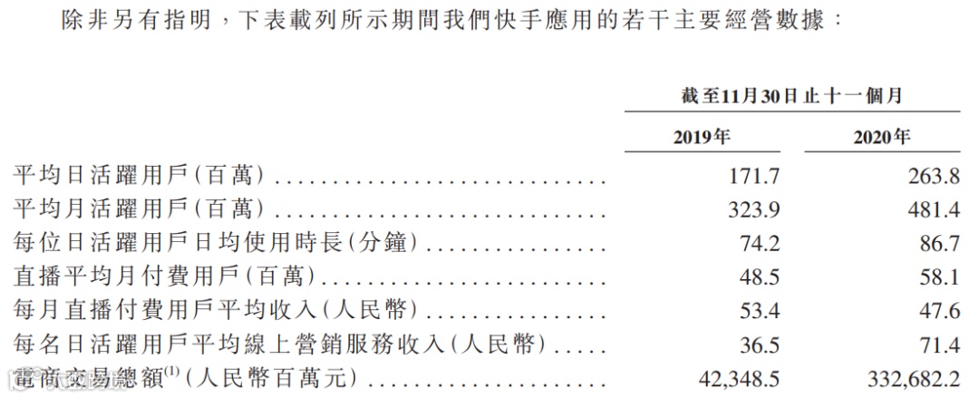 根据1月26日披露的最新招股资料,2020年前11个月,快手APP的快手日活和月活数据为2.638亿、4.814亿,对比2020年前9个月的统计,这两项数据分别为2.624亿和4.829亿。这意味着快手9月发布招股书之后的三个月里,日活只出现了微幅增长,而月活则出现了轻微的下滑。
