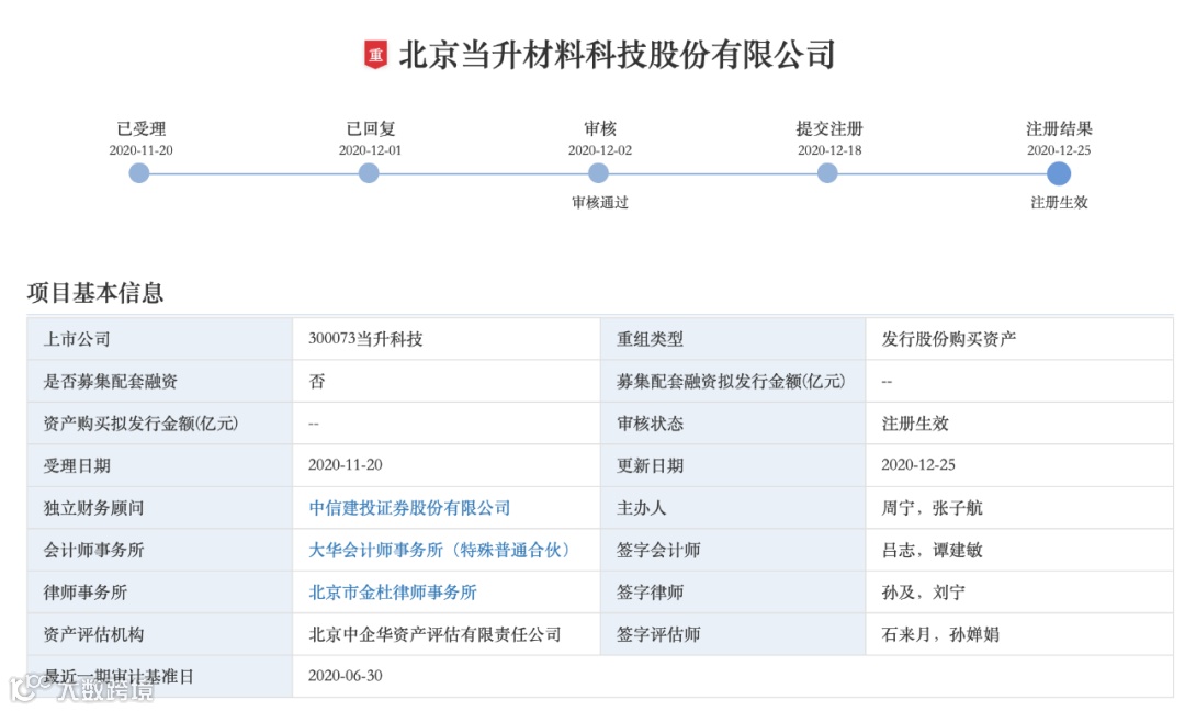 据了解,当升科技重组项目从申请到注册仅31个工作日,公开资料显示,受理日期2020年11月20日,注册生效日期12月25日。当升科技拟向控股股东发行股份购买其持有常州当升31.25%的少数股权,交易完成后常州当升将成为全资子公司,该项目没有募集配套资金。财务顾问为中信建投。