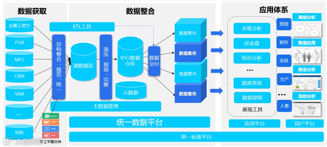 随着企业信息化建设突飞猛进,企业管理职能精细划分,信息系统围绕不同的管理阶段和管理职能展开(如ERP、MES、PLM,SRM、CRM、HR等),企业中“多系统并存、系统数据耦合度高”的情况越来越明显。各个业务系统间数据分散,标准均不统一,没有统一的数据分析平台,多数据源分析困难。