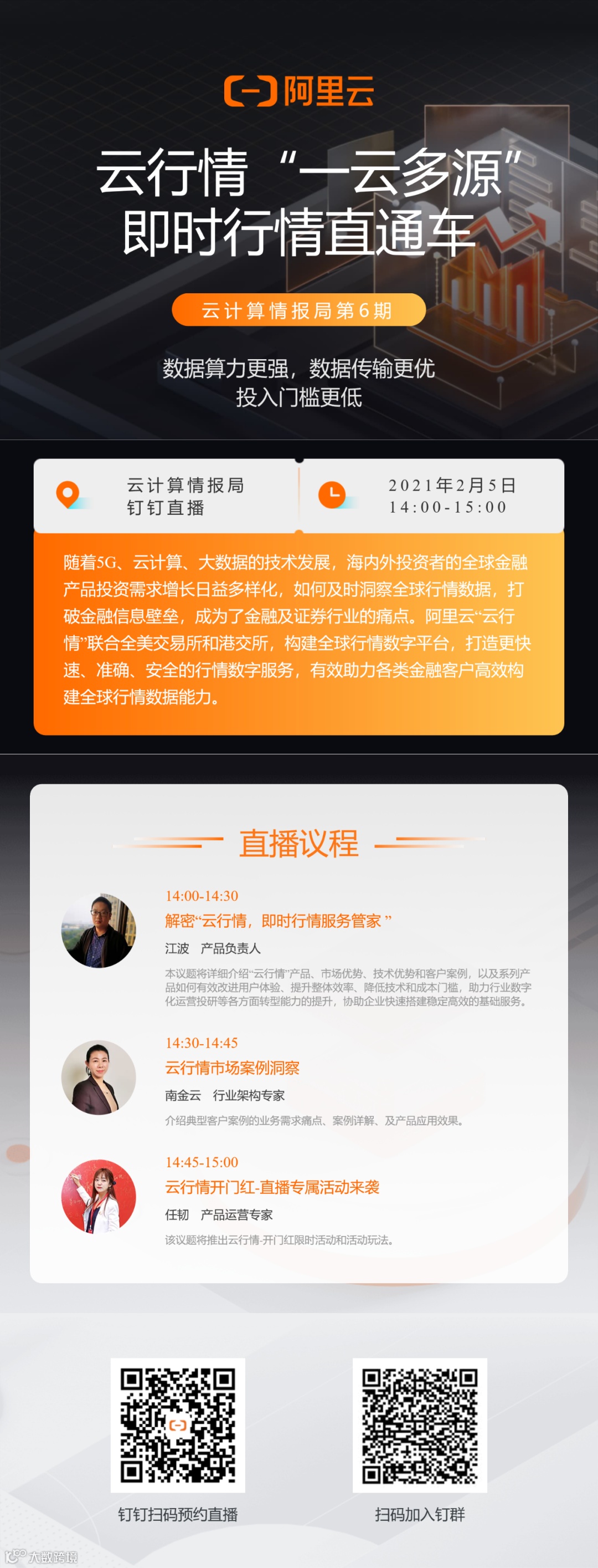 阿里云“云行情”即时行情数据服务,“一云多源”交易所主站数据专线直连,基于阿里云全球容灾网络系统,实现美股、港股行情数据纳秒级分发,数据能力更强、数据传输更优、投入门槛更低,助力客户完成金融科技场景赋能,实现国际、国内指数行情服务数据模式升级。即日起,云行情特举办【开门红】限时活动,全年基础服务费7.5折,惊喜来袭:http://click.aliyun.com/m/1000237882/,也可扫码观看:
